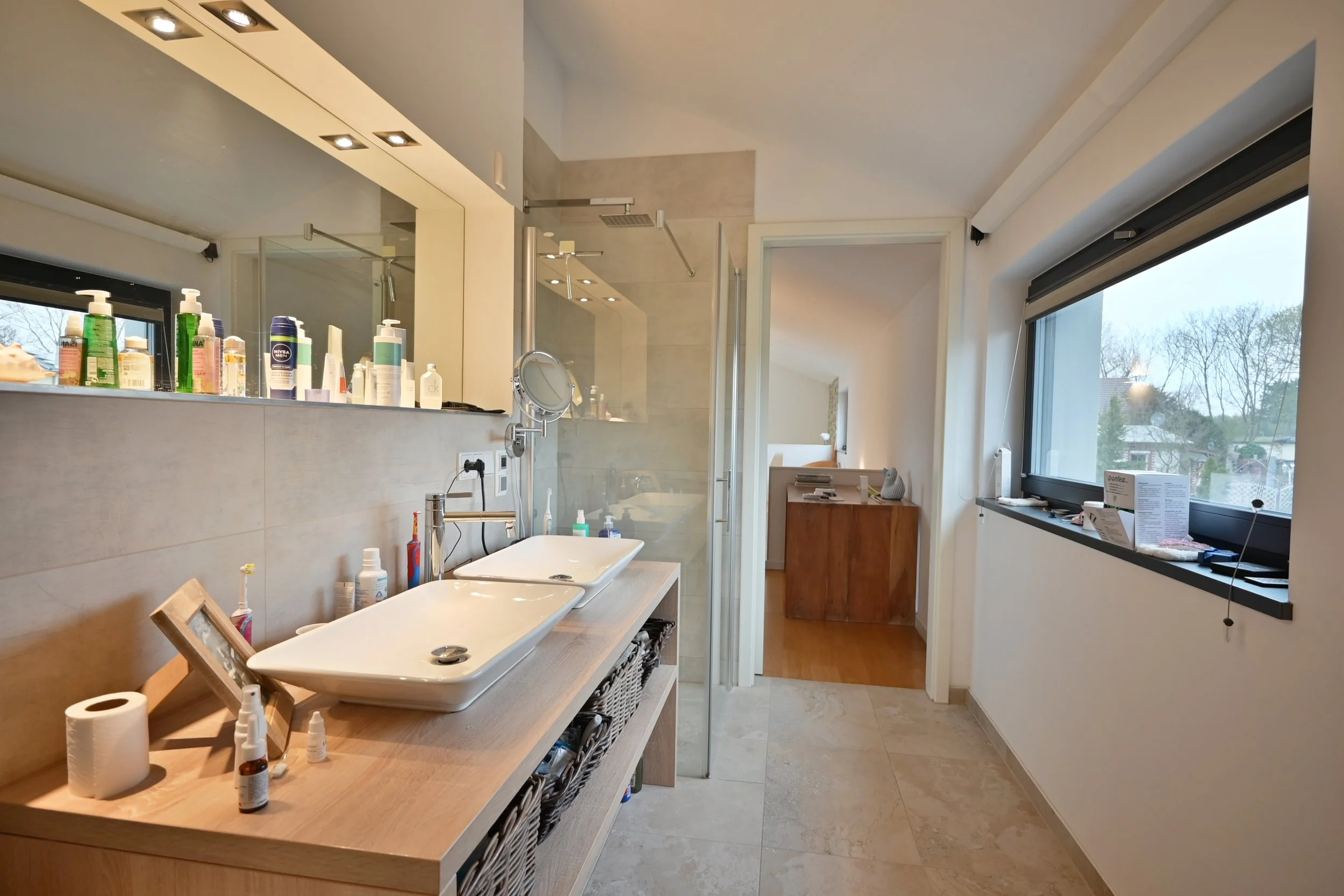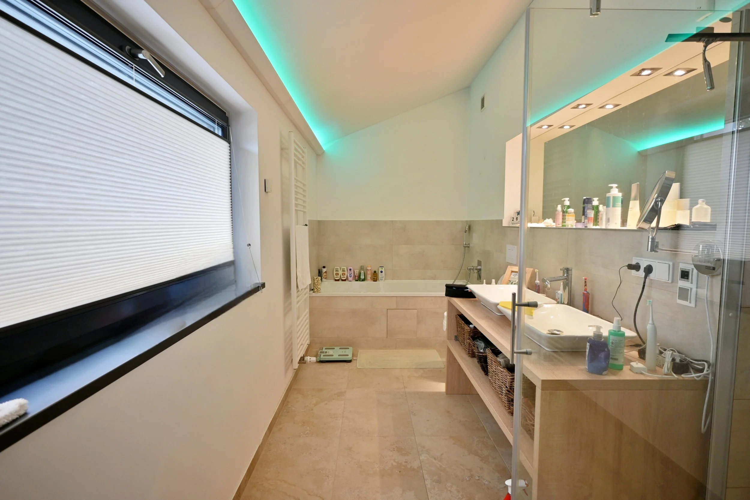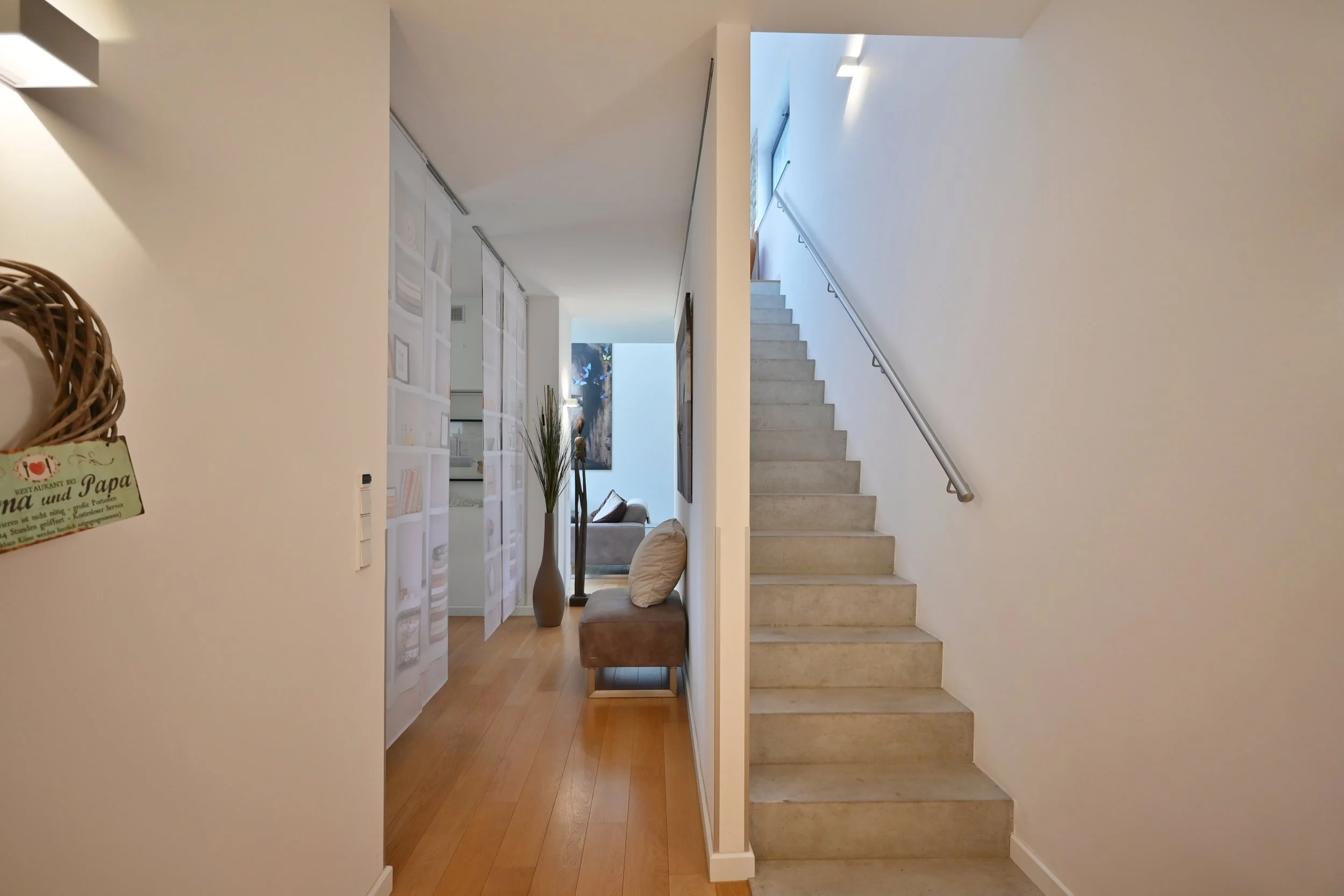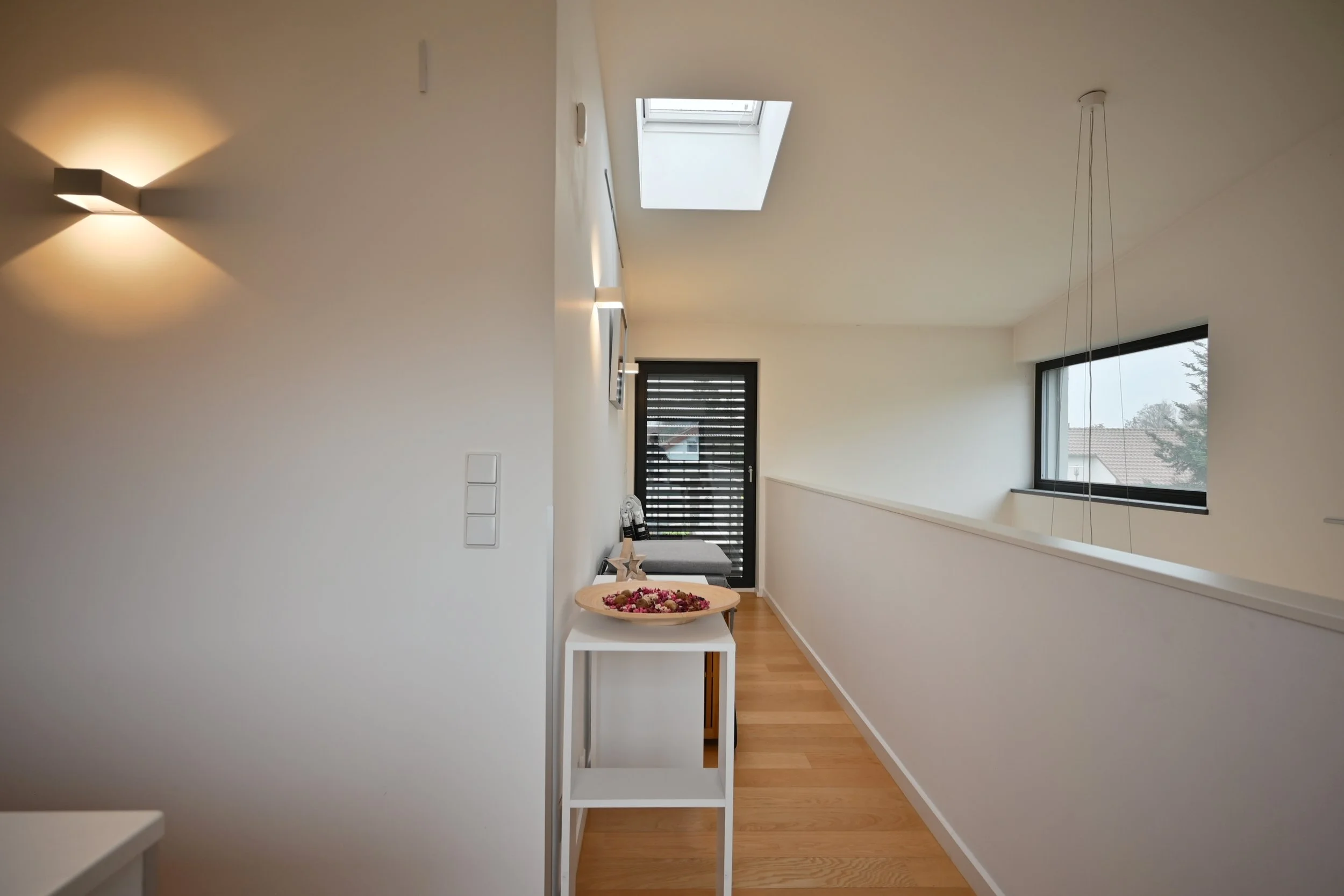 Jedoch nicht nur der Garten steht Ihnen zur freien Nutzung zur Verfügung, sondern auch die großzügigen Balkone und Terrassen laden zum Entspannen und Genießen ein. Der große Balkon im Obergeschoss ist aus den Räumlichkeiten zugänglich und bietet einen freien Blick in den grünen Garten und die durchweg gepflegte Nachbarschaft. Diese besteht zum großen Teil aus Einfamilienhäusern mit großen Garten und Grundstücken. Ebenfalls verfügt das Architektenhaus über eine große Terrasse, die sich in den Garten öffnet und das Haus im hinteren Teil verbindet. Dort sitzt es sich besonders bei den heißen Tagen sehr angenehm und das große Sonnensegel spendet angenehmen Schatten.
