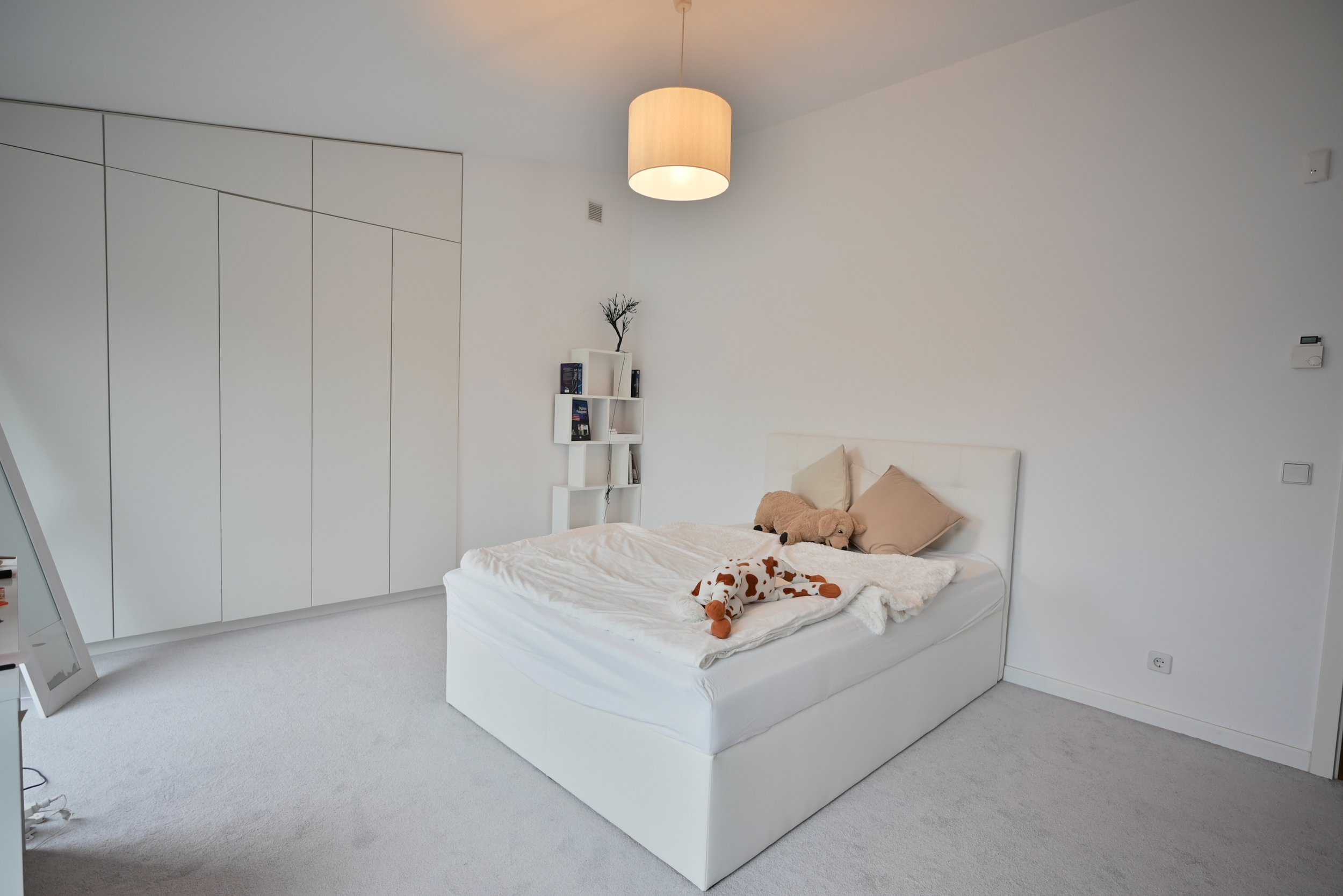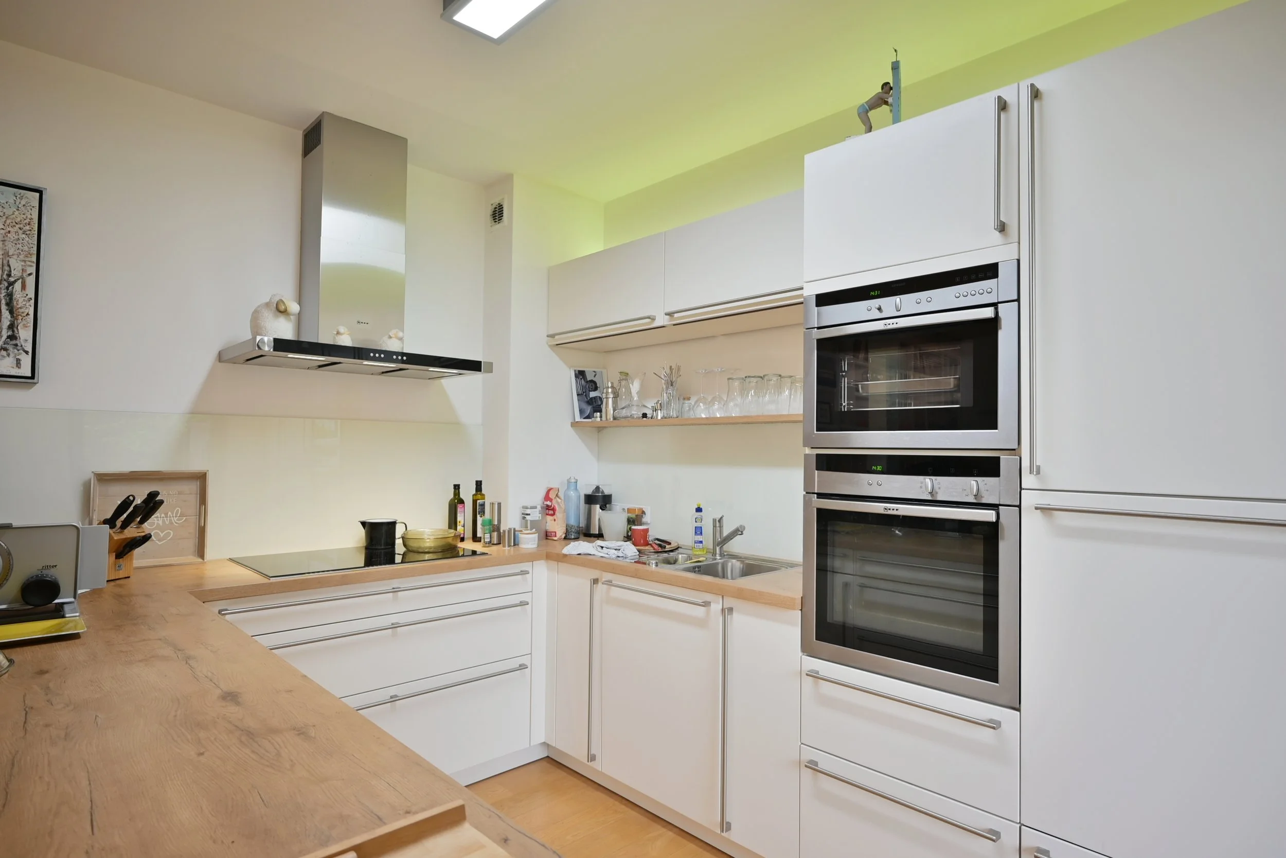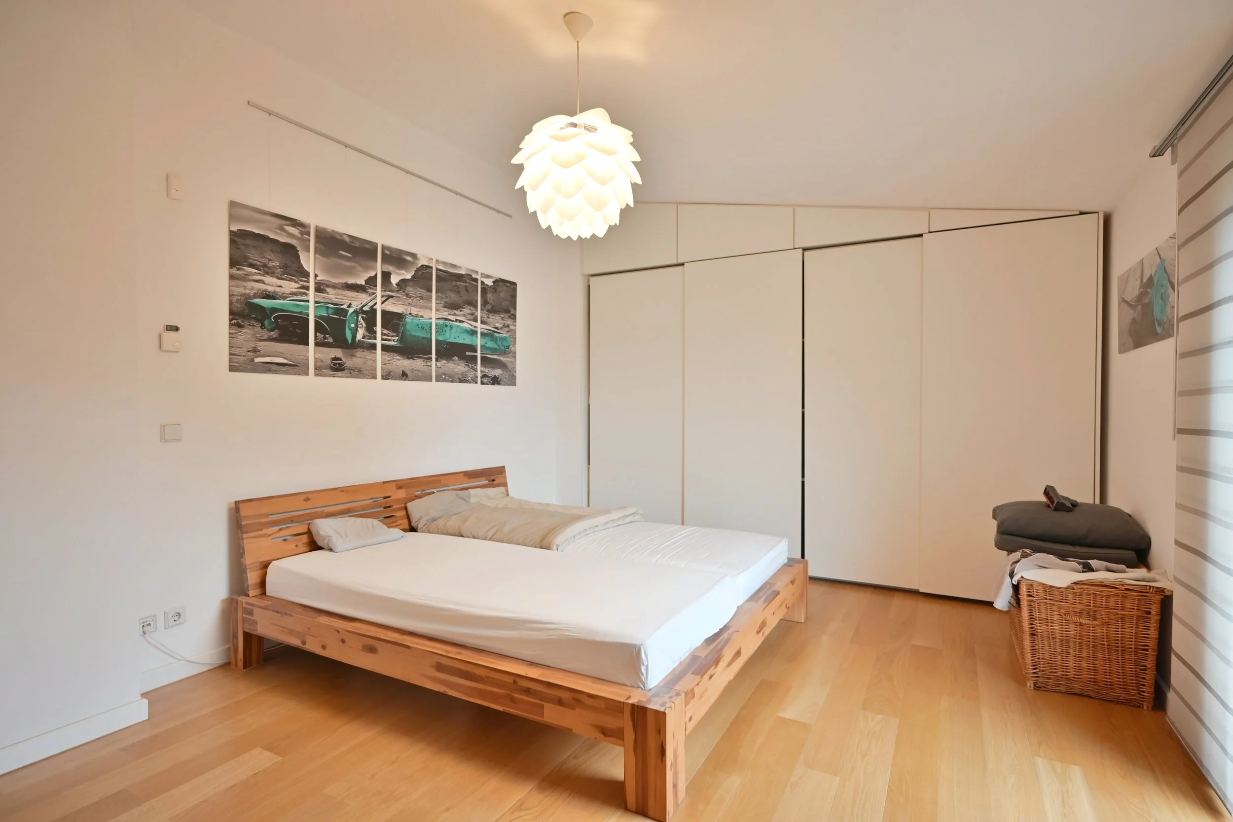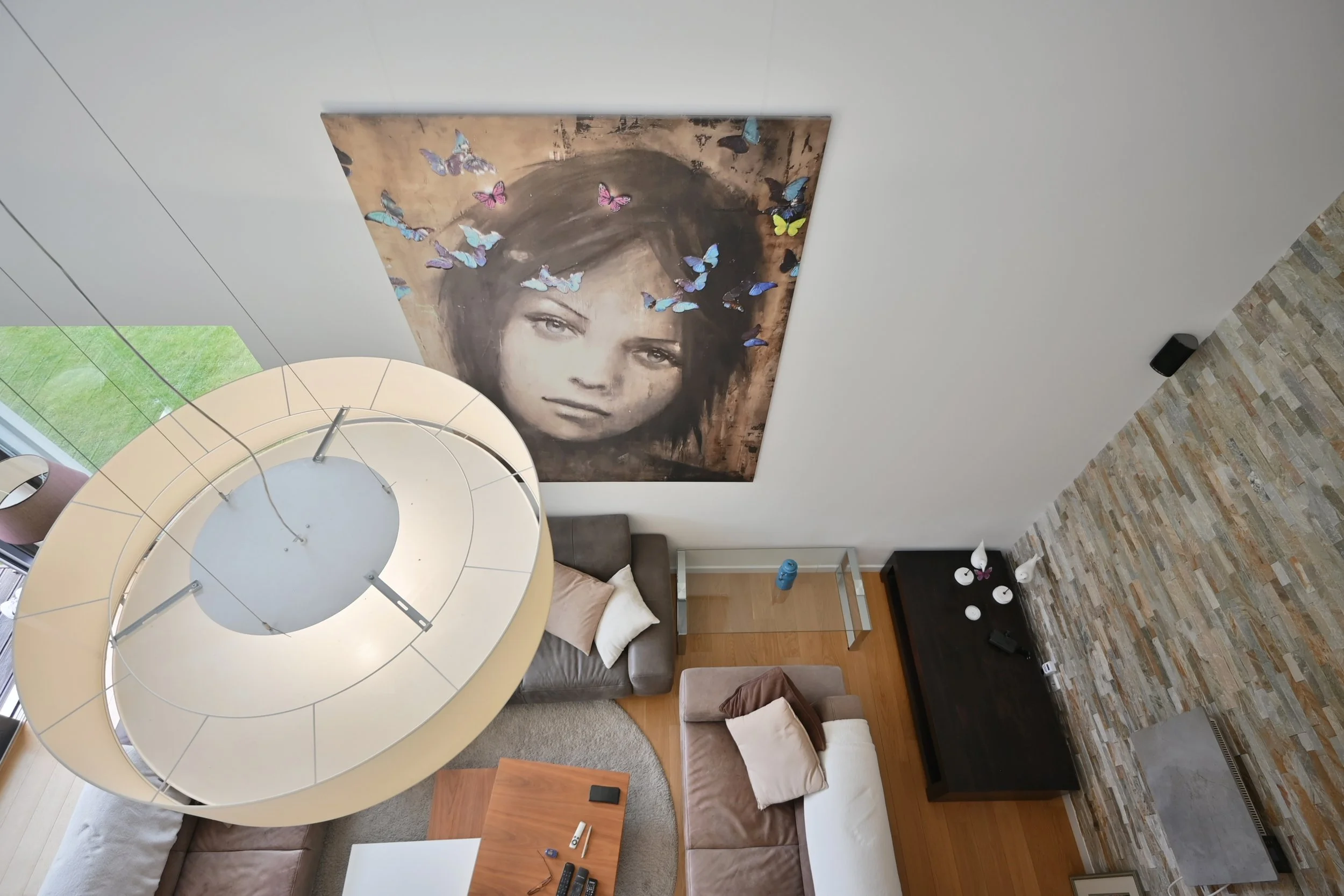 Jedoch nicht nur der Garten steht Ihnen zur freien Nutzung zur Verfügung, sondern auch die großzügigen Balkone und Terrassen laden zum Entspannen und Genießen ein. Der große Balkon im Obergeschoss ist aus den Räumlichkeiten zugänglich und bietet einen freien Blick in den grünen Garten und die durchweg gepflegte Nachbarschaft. Diese besteht zum großen Teil aus Einfamilienhäusern mit großen Garten und Grundstücken. Ebenfalls verfügt das Architektenhaus über eine große Terrasse, die sich in den Garten öffnet und das Haus im hinteren Teil verbindet. Dort sitzt es sich besonders bei den heißen Tagen sehr angenehm und das große Sonnensegel spendet angenehmen Schatten.