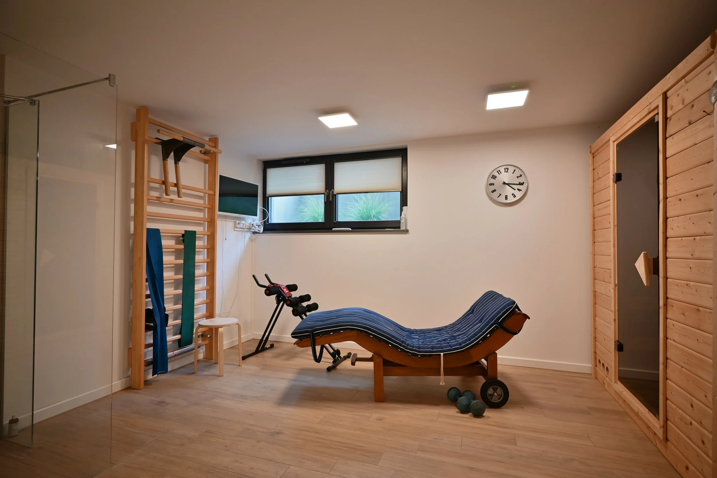 Das gesamte Haus ist vollunterkellert und verfügt über sehr viel Platz im unteren Stockwerk. Die Deckenhöhe beträgt ca. 2,31m und schafft so ein sehr angenehmes Gefühl. Für Ihre körperliche Fitness ist ebenso gesorgt. Der großzügige Fitnessraum im Untergeschoss steht für Übungen und ein Trainingsprogramm bereit und bietet die Möglichkeit für ein Gym in dem eigenen Anwesen. Zur Erholung wurde eine eigene Sauna verbaut, die sich an den Fitnessraum anschließt und ebenfalls genutzt werden kann. Direkt daneben befindet sich ein separates Badezimmer, welches über ein extra WC, sowie eine Dusche verfügt. Im Wohnkeller befindet sich ein gut geschnittenes Gästezimmer, sowie ein zusätzlicher Abstellraum.